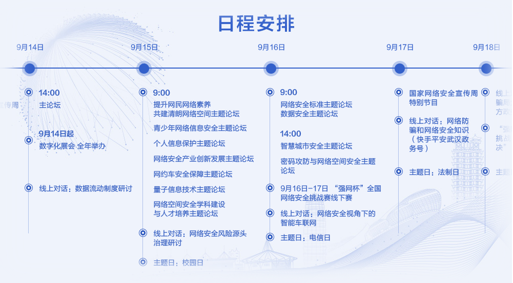网络安全高峰论坛包括1场主论坛和11场分论坛,分论坛围绕个人信息保护、量子信息技术、网络安全标准、网络安全产业创新发展、数据安全、密码攻防与网络安全、智慧城市安全等议题,以线上、线下等方式举办,并开展线上网络安全课堂、全民网络安全知识竞赛等活动。